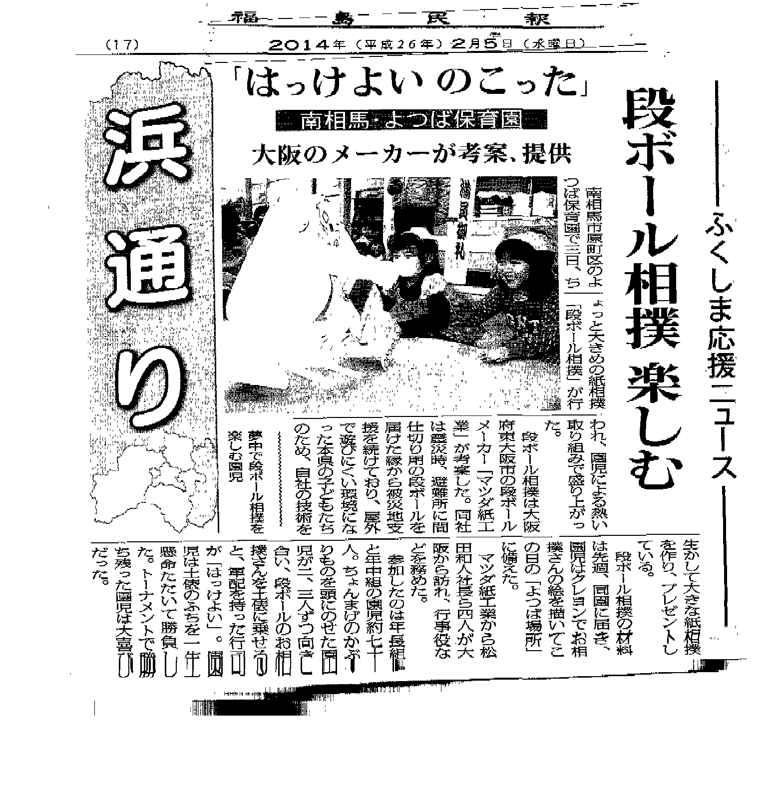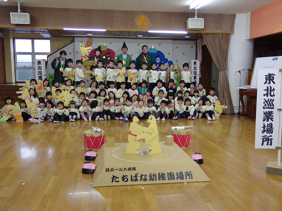 2月3・4日に名取が保育所(宮城)、よつば保育所(福島)、たちばな幼稚園(福島)にてダンボール大相撲 大会を開催致しました。 子供たちの熱気ですごい盛り上がりでした。 大相撲大会のあと、「明日も来てね」という子供たちの言葉に、来てよかったなぁと感じた1日でした。 福島民報でもご紹介頂きました。