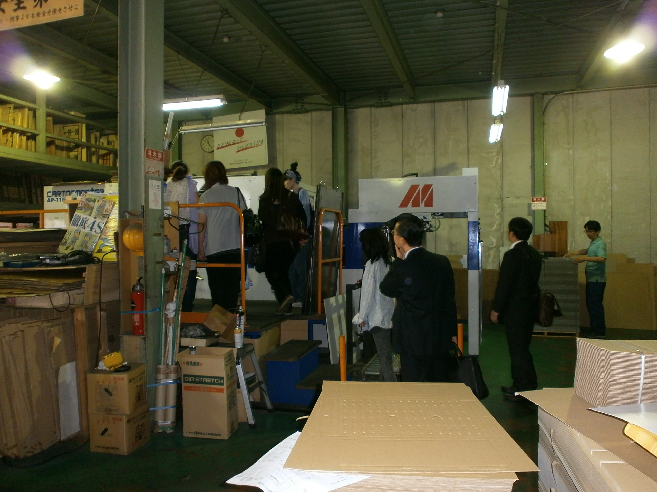 本社工場講堂にて松田社長の講演が行われ、講演終了後、展示室・本社工場・第二工場に案内しました。当社オリジナル製品では、チェスト・デスクセット・貯金箱キットを見て段ボールでできている事にたいへん驚いていました。